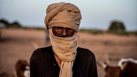 Un troupeau de produits laitiers broute sur des terres à l’extérieur du camp de réfugiés de Mbera en Mauritanie. La sécurité est stricte autour du périmètre et les forces de police locales gardent un œil sur les intrus. | Simon Marks pour POLITICO