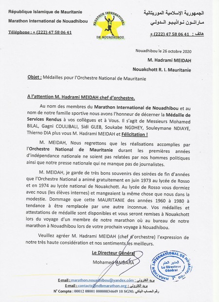 Haidara : Dans notre philosophie des choses de la vie la République Islamique de Mauritanie n’est pas issue du néant et n’est pas un « Big Bang » mais une œuvre construite par des Femmes et des Hommes. L’Orchestre National a eu à jouer un grand rôle pour l’UNITE NATIONALE. Nos médailles pour SERVICES RENDUS seront accrochées à Messieurs Mohamed BILAL, Gagni COULIBALI, Sidi GLEB, Soukabé NGDHEY, Souleymane NDIAYE, Thierno DIA et M. Hadrami MEIDAH.