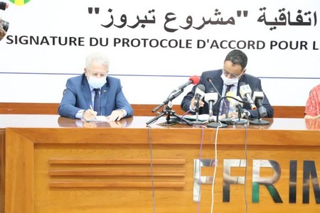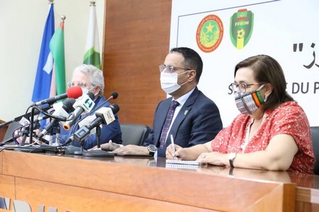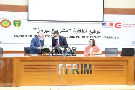 FFRIM - Dans le cadre du projet TABRUZ, la Fédération Mauritanienne de football, représentée par son Président, Monsieur Ahmed Yahya, a signé un protocole administratif avec la Coopération espagnole, représentée par sa coordinatrice, Madame Rita Santos et l’État d’Espagne, représenté par l’Ambassadeur de l’Espagne en Mauritanie, Son Excellence Monsieur Jesús Ignacio Santos Aguado, ce vendredi 6 novembre à l’amphithéâtre de la FFRIM.
