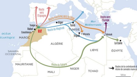 Le haschisch produit dans le Rif traverse la frontière entre le Maroc et l'Algérie. De là, il peut prendre plusieurs destinations : le marché local ; l’Espagne et la France via les ports d’Alger et d’Oran ; et la Tunisie, où il alimente aussi le marché local, part en bateau vers l’Europe ou poursuit jusqu’en Libye.