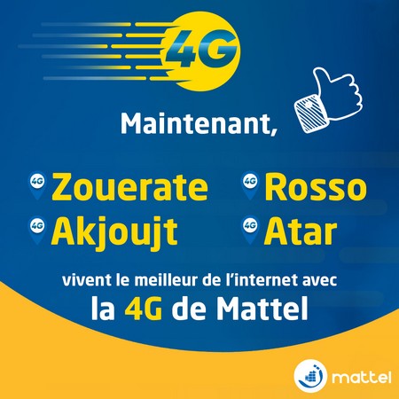 Après le lancement réussi de son service 4G à Nouakchott et Nouadhibou avec la meilleure qualité de service et une expérience client fluide et simplifiée, Mattel a le plaisir d’annoncer à son aimable clientèle que le service 4G est désormais disponible dans les villes de Zouerate, Rosso, Akjoujt et Atar.