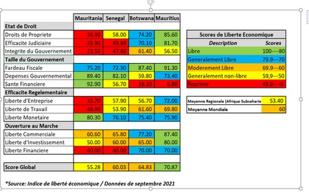 Le tableau présenté ci-dessous synthétise les informations recueillies à partir de l’indice de liberté économique qui reprend les scores attribués aux pays comparés concernant la liberté économique et commerciale ; l’État de droit à savoir la taille du gouvernement, l’efficacité réglementaire et l’ouverture du marché. Tout d'abord, on constate que la Mauritanie est globalement mal notée avec 55,28 par rapport aux trois autres pays, objet de cette étude, que sont le Sénégal avec 60,03, le Botswana avec 64,83 et l’ile Maurice avec 70,87.