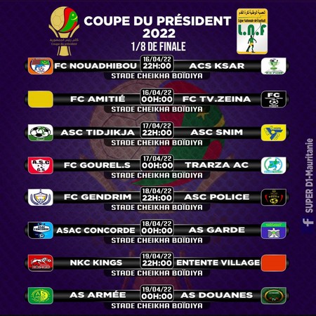 Les huitièmes de finale de la Coupe du Président débutent ce samedi avec deux matchs au programme : FC Nouadhibou vs ACS Ksar et FC Amitié vs FC Tévragh-Zeina.
