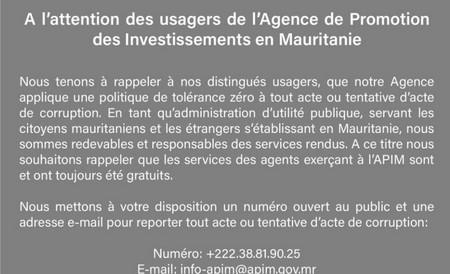 La Dépêche - L’agence de promotion des investissements en Mauritanie a mis en place un numéro vert pour permettre aux usagers de ses services de dénoncer tout acte de corruption éventuel, peut-on constater vendredi à la lecture d’une note de la directrice générale de l’agence.