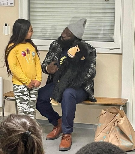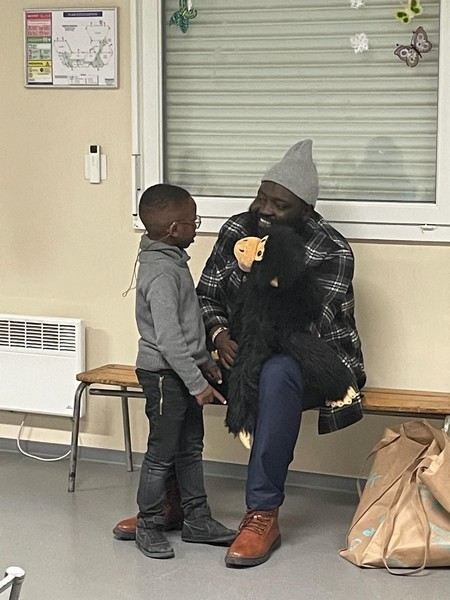 ï€ Le mardi 13 décembre 2022, par l’association Les Ateliers de Balou, qui a invité l’artiste et son acolyte Bougal au goûter de noël des enfants de l’aide aux devoirs. Ce fut, un moment d’animation, d’échange et de curiosité pour les enfants (voir photos).