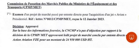 #Cridem – Le site Alakhbar a annoncé vendredi que la Commission de Passation des Marchés Publics du Ministère de l’Equipement et des Transports (CPMP/MET) a approuvé jeudi l’acquisition d’un avion présidentiel pour une valeur de 24,9 millions de dollars, soit 9 milliards MRO.