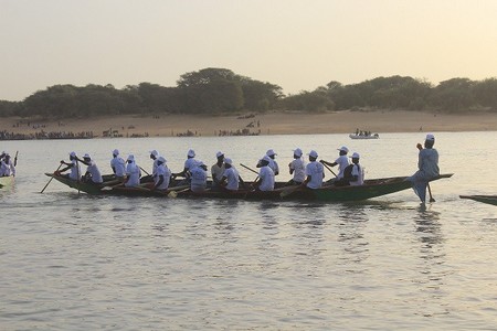 Ghazouani lors de la course des pirogues, entre le Wali du Gorgol (en tenue bleue) et le ministre de la Culture – Crédit Aidara