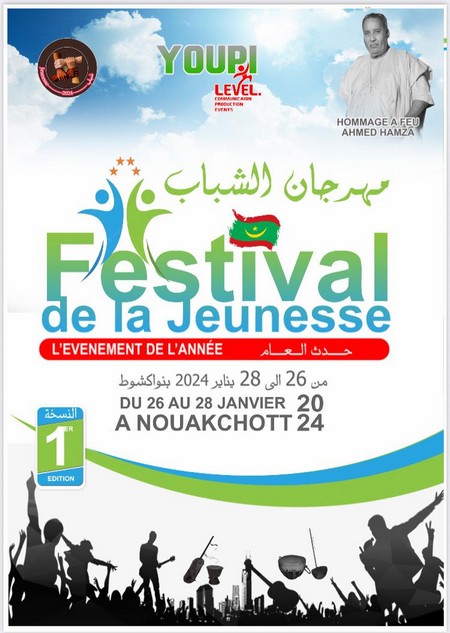 Nouakchott, 12 septembre 2023 - Le label « Youpi Level Communication Production Events » présente, en collaboration avec le Mouvement Jeunesse 2024, la première Edition du « Festival de la Jeunesse » qui aura lieu à Nouakchott les 26, 27 et 28 janvier 2024.