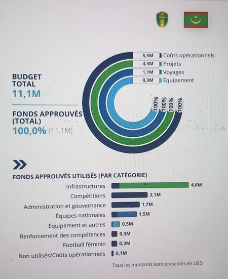 Par ailleurs, 2,1 millions USD sont allés aux compétitions, tandis que 1,5 million USD a aidé les équipes nationales mauritaniennes à participer à des compétitions internationales et des matches amicaux, mais aussi d’organiser des rassemblements.