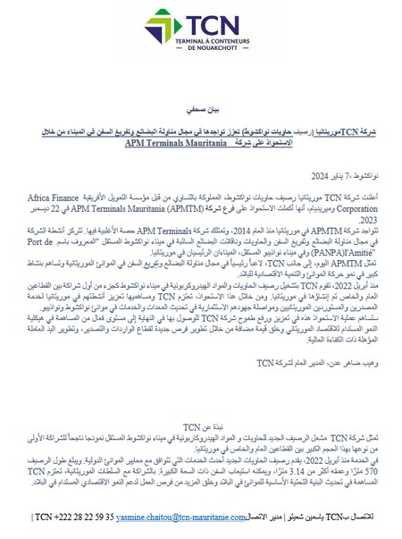 08-01-2024 11:27 - Communiqué de presse de Terminal à Conteneurs de Nouakchott (TCN)