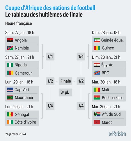 Enfin, le Cap-Vert, sensation du premier tour en terminant premier du groupe B devant l’Égypte et le Ghana, pourrait poursuivre sa belle épopée face à la Mauritanie auteur de son premier succès à la CAN face à l’Algérie (1-0). Les quarts de finale se joueront ensuite les 2 et 3 février, les demi-finales se disputeront, elles, le 7 février et la finale se déroulera quatre jours plus tard au stade Alassane Ouattara à Abidjan.