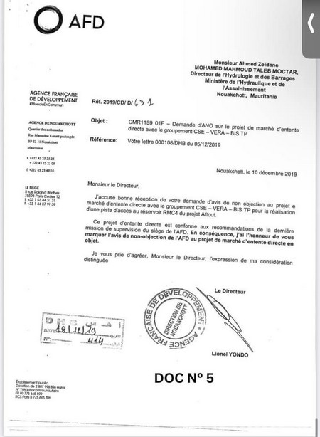 Avis de non-objection de l’AFD au marché de construction de la piste, remporté sans appel d’offres par le consortium BIS TP – Vera – CSE.